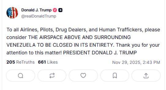 «Всем авиакомпаниям, пилотам, наркоторговцам и торговцам людьми, пожалуйста, имейте в виду, что ВОЗДУШНОЕ ПРОСТРАНСТВО НАД ВЕНЕСУЭЛОЙ И ВОКРУГ НЕЁ ЗАКРЫТО», — написал он в Truth Social.