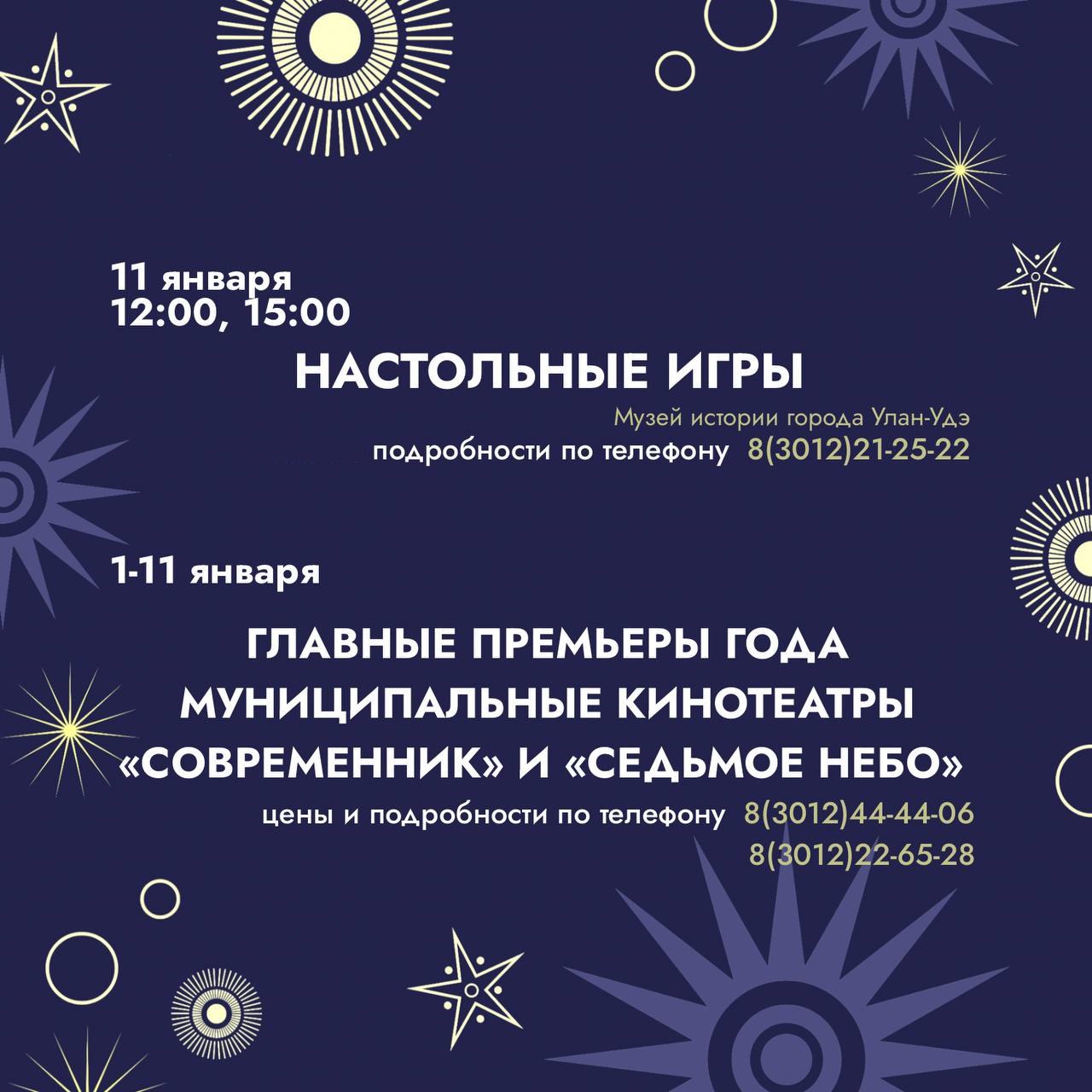 Полный свод городских мероприятий на декабрь и новогодние каникулы, а также туристические маршруты в районы Бурятии можно увидеть по ссылке
