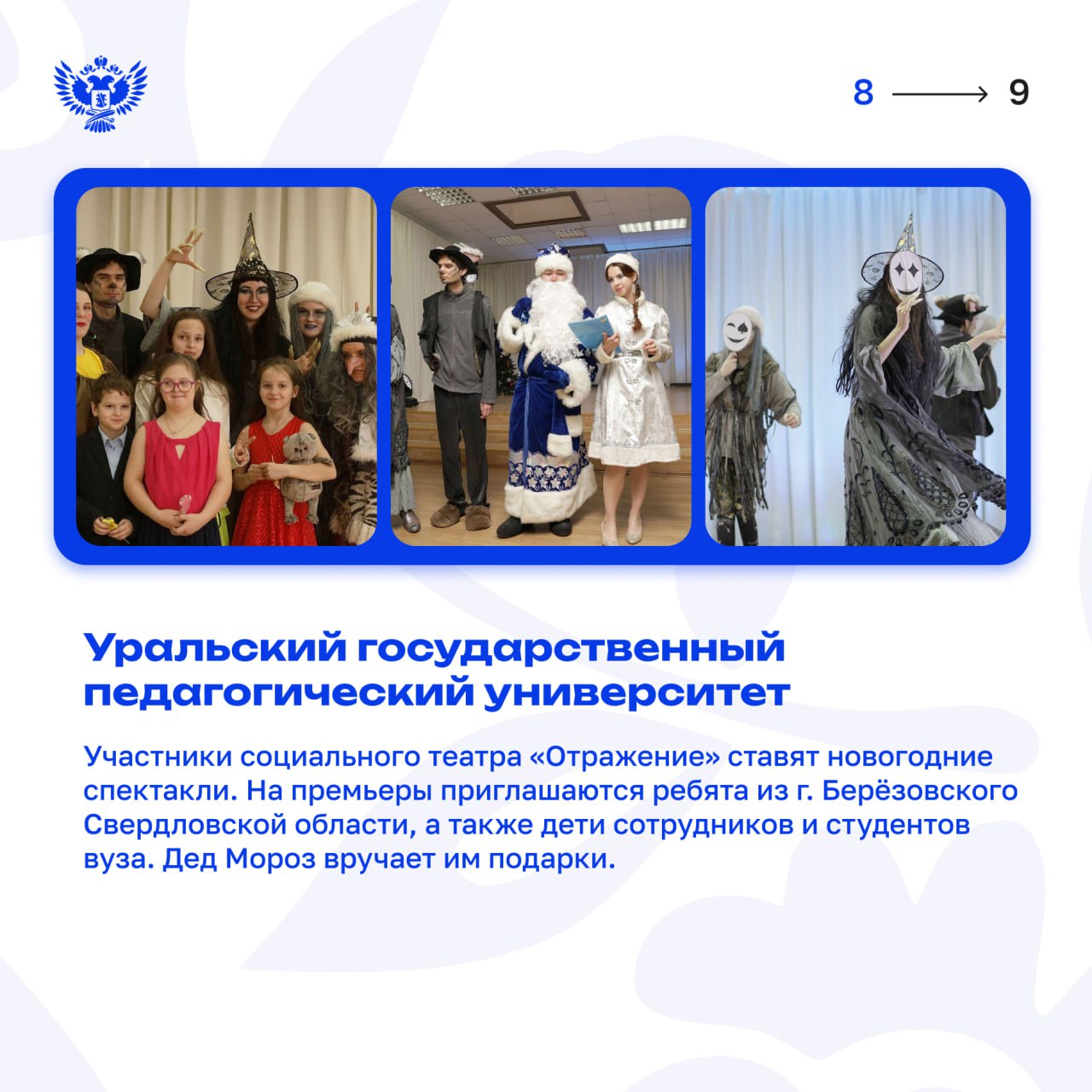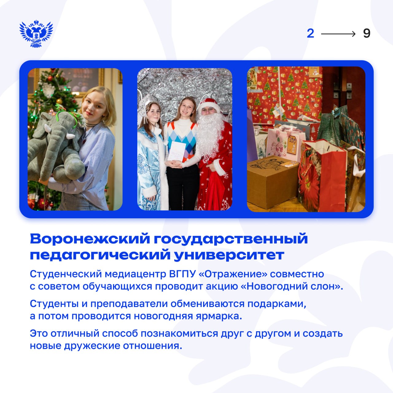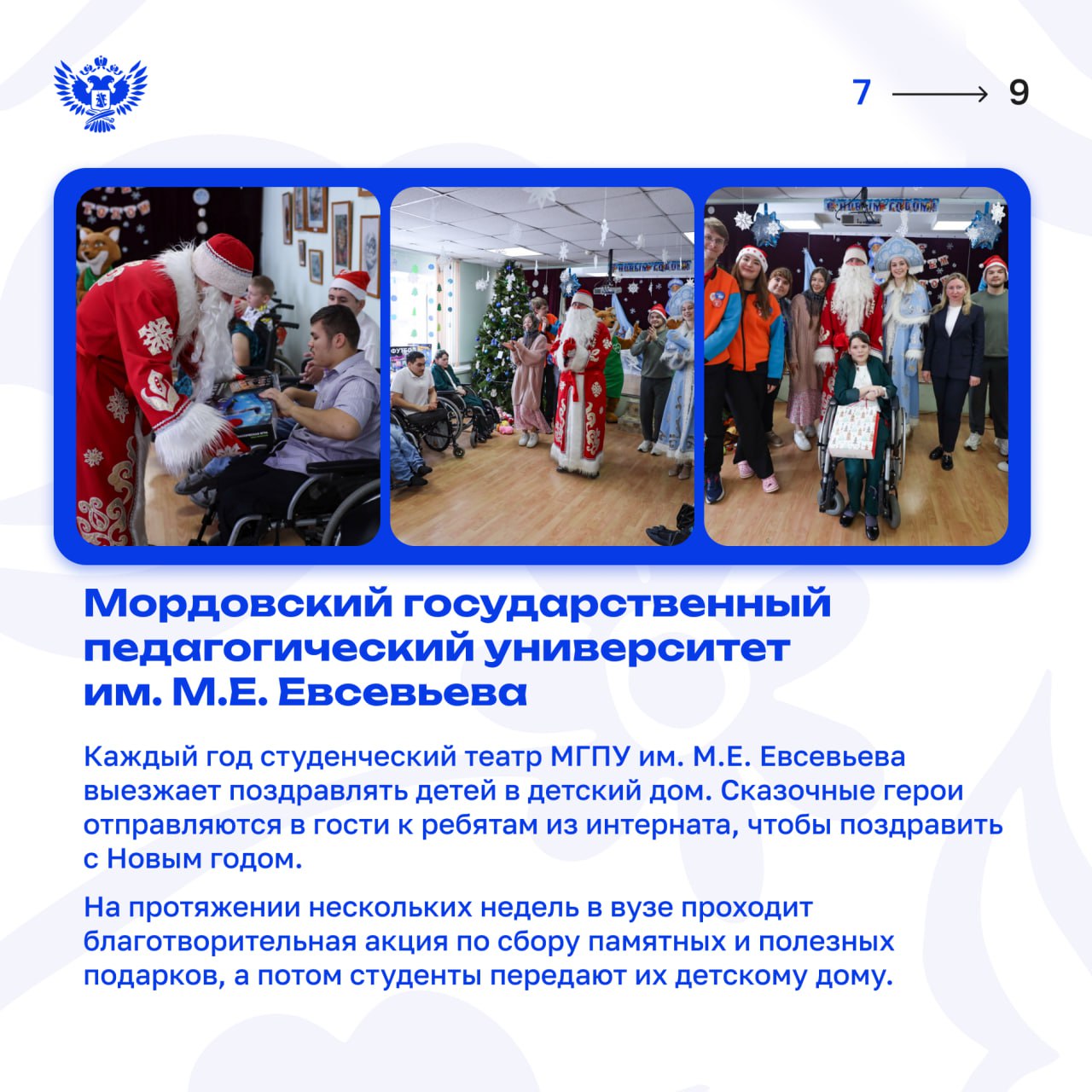 Педагогические университеты тоже бережно хранят праздничные традиции. Студенты и преподаватели готовят театрализованные представления, проводят ярмарки подарков, посещают детские дома и дарят детям подарки.