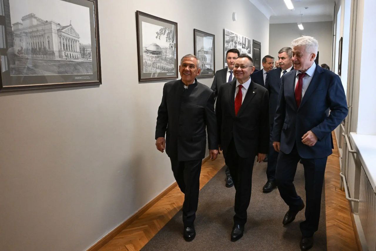 Программа визита началась с осмотра Музея истории КГАСУ, где представлена масштабная экспозиция, посвященная развитию строительного образования в Казани — от основания Промышленного училища в 1890-х годах до наших дней. Музей хранит память о выдающихся архитекторах, преподавателях и выпускниках, заложивших основу архитектурного облика Казани и Татарстана. Среди уникальных экспонатов — форменная куртка студенческого отряда, которая в свое время принадлежала Иреку Файзуллину.