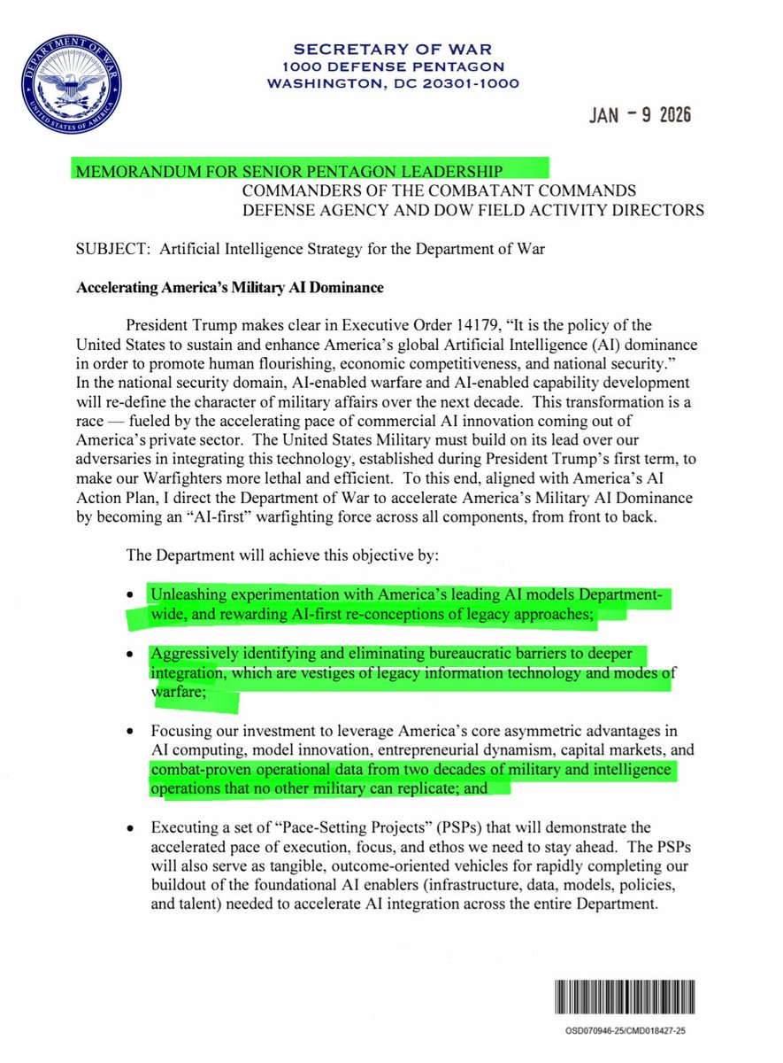 Согласно внутренней записке Пентагона, США намерены радикально трансформировать свои вооруженные силы, сделав искусственный интеллект центральным элементом стратегии. Планы предусматривают полную автоматизацию военных операций — от разведки и принятия решений до непосредственного ведения боевых действий. Цель — максимально исключить человека из цикла, повысив скорость и эффективность.