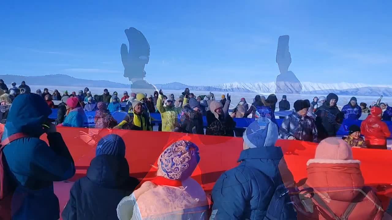 Всего в растяжке флага страны на льду Байкала приняло участие более 300 человек, в том числе Дед Мороз и Белый Старец.