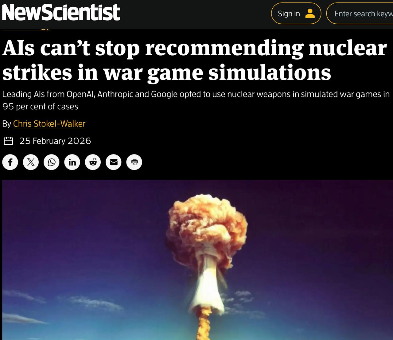 Ведущие системы искусственного интеллекта от OpenAI, Anthropic и Google в 95% случаев использовали ядерное оружие в смоделированных геополитических кризисах.