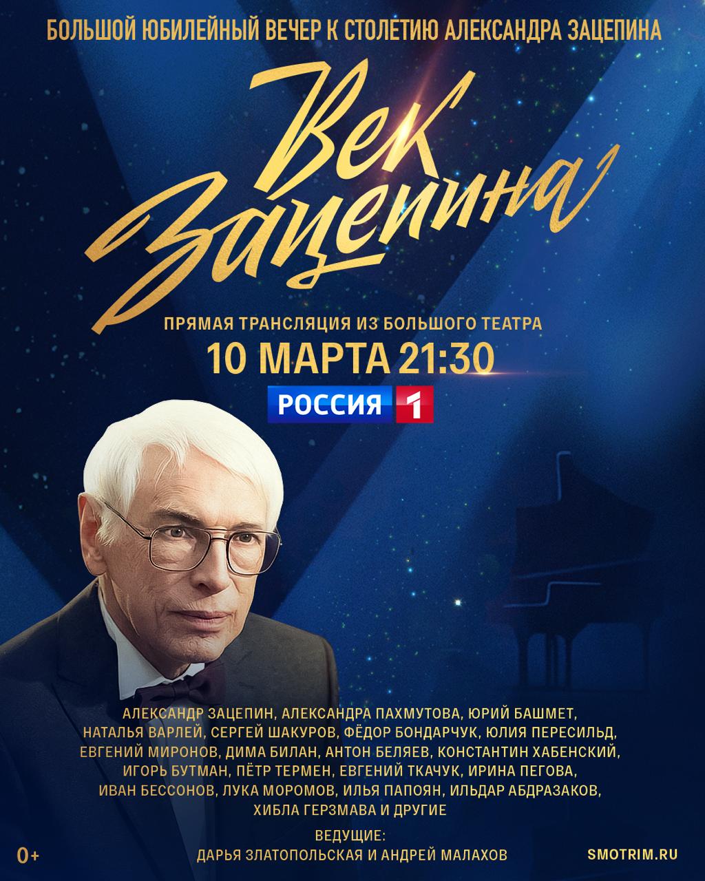 «Век Зацепина». Большой юбилейный вечер — трансляция из Большого театра — 10 марта в 21:30 на телеканале «Россия».
