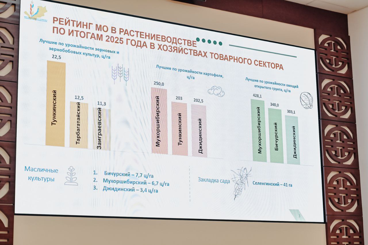 По словам Зампреда Правительства — министра сельского хозяйства Амгалана Дармаева, общая посевная площадь в 2025 году составила 132,5 тыс. га, в том числе зерновых и зернобобовых культур посеяно на площади 71,3 тыс. га, картофеля посажено на площади 6,6 тыс. га, овощей открытого грунта — 1,0 тыс. га, технических культур — 8,2 тыс. га, кормовых — 45,4 тыс. га.