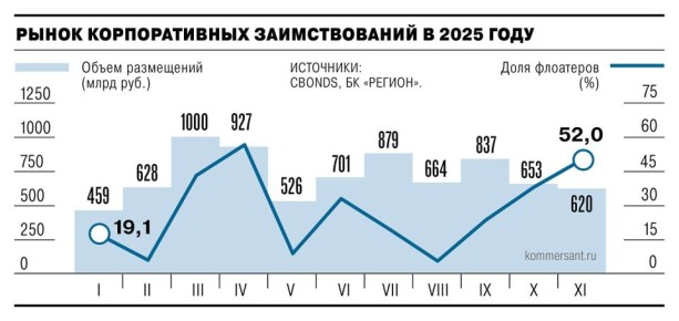 Ноябрь на рынке публичных заимствований оказался худшим за последние пять месяцев: компании и банки провели минимальное с июня количество сделок (156) на сумму около 620 млрд руб. Эмитенты снижают свою активность как в рублевом, так и валютном...