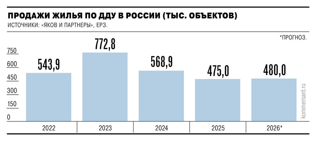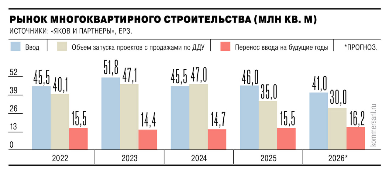 Активность на рынке жилищного строительства в России в 2026 году снизится, считают эксперты. Так, ввод многоквартирных домов сократится на 11% год к году, до 41 млн кв. м, а объем новых проектов — на 14%.