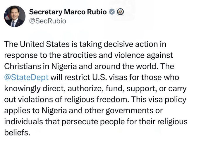 Соединенные Штаты предпринимают решительные меры в ответ на зверства и насилие против христиан в Нигерии и по всему миру. Госдепартамент ограничит выдачу виз США тем, кто сознательно руководит, санкционирует, финансирует, поддерживает или осуществляет нарушения свободы вероисповедания.Эта визовая политика применяется к Нигерии, а также к другим правительствам или лицам, преследующим людей за их религиозные убеждения,