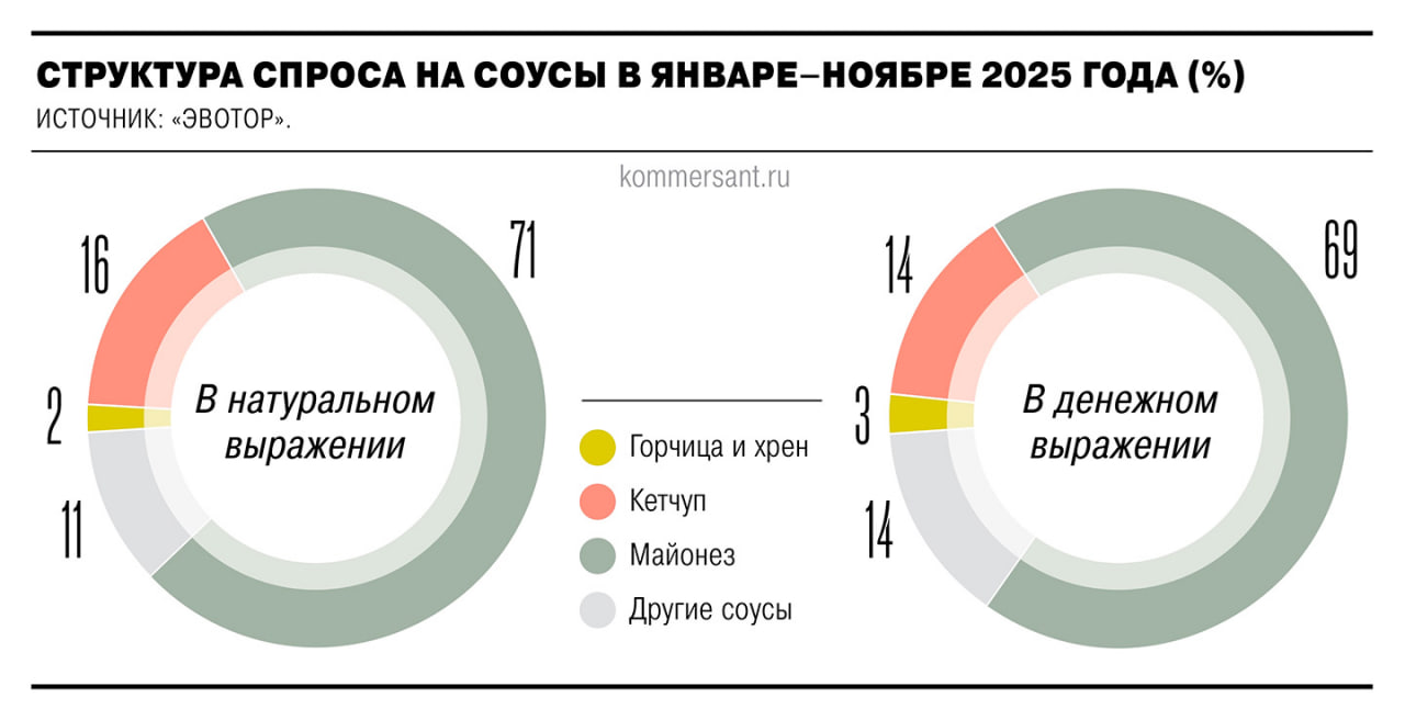 Количество брендов кетчупа в январе—ноябре 2025 года увеличилось на 8%, подсчитали аналитики «Эвотор». Производителей стало больше на 9%. Это единственная категория соусов, продемонстрировавшая рост.