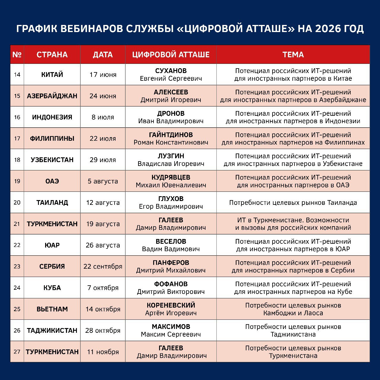 Продолжается цикл вебинаров с «цифровыми атташе» по ключевым зарубежным рынкам. Публикуем расписание на 2026 год — все даты и темы в нашей инфографике.
