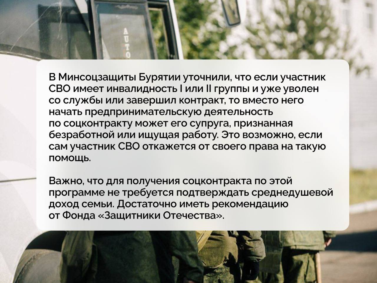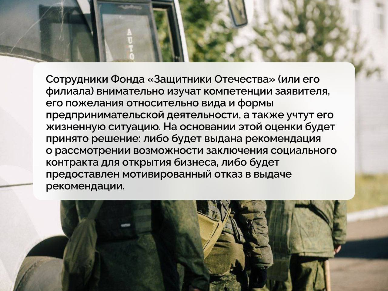 Теперь, если военнослужащий уволен со службы или завершил контракт и официально признан безработным или активно ищет работу, он может в приоритетном порядке получить государственную социальную помощь в виде социального контракта на открытие собственного бизнеса, финансируемого по нацпроекту «Семья».