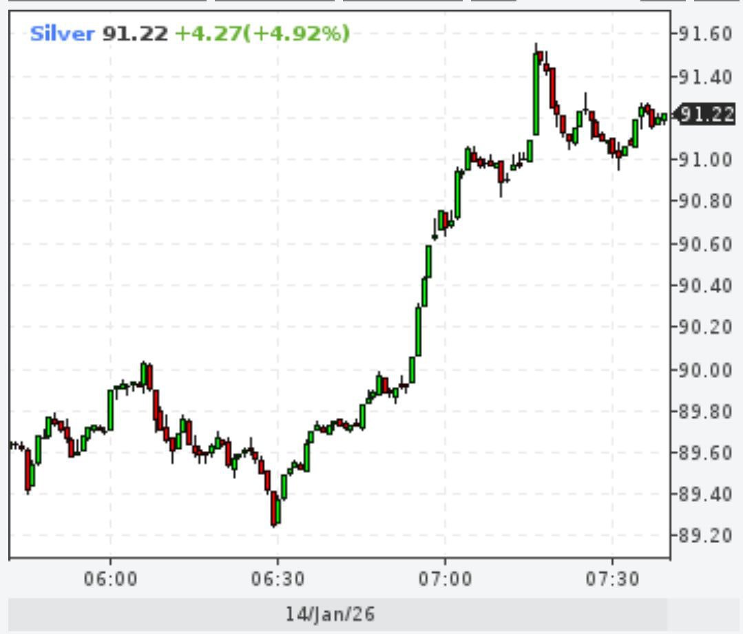 Это следует из данных утренних торгов. По состоянию на 7:23 мск цена мартовского фьючерса на серебро на нью-йоркской бирже Comex росла на 5,27% — до $90,905 за унцию.
