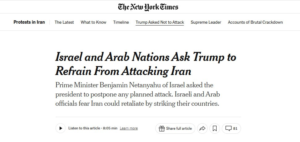 Наиболее вероятный сценарий военного удара США по Ирану пока откладывается. Ключевой причиной стала позиция Израиля. Согласно информации, циркулирующей в израильских и американских СМИ (Axios, Jerusalem Post и т.д.), Тель-Авив дал понять Вашингтону, что подготовленный американской стороной вариант операции «не решает главной задачи» — не способен нанести неприемлемый ущерб ядерной программе Ирана и тем более не ставит под угрозу существование нынешнего режима.