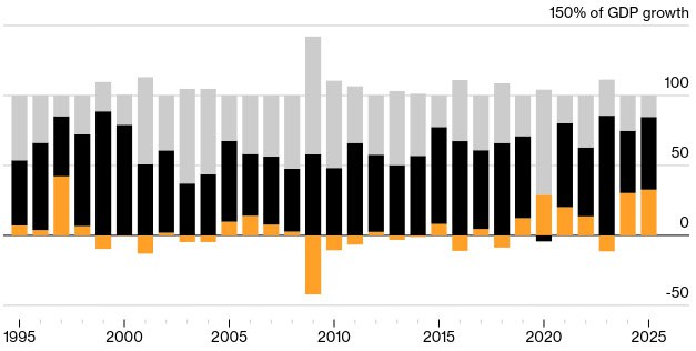 Чистый экспорт товаров и услуг добавил почти 33% к прошлогоднему росту валового внутреннего продукта КНР. Это более чем на два процентных пункта выше уровня 2024 года и самый высокий показатель с 1997 года, когда он составлял чуть более 42%.