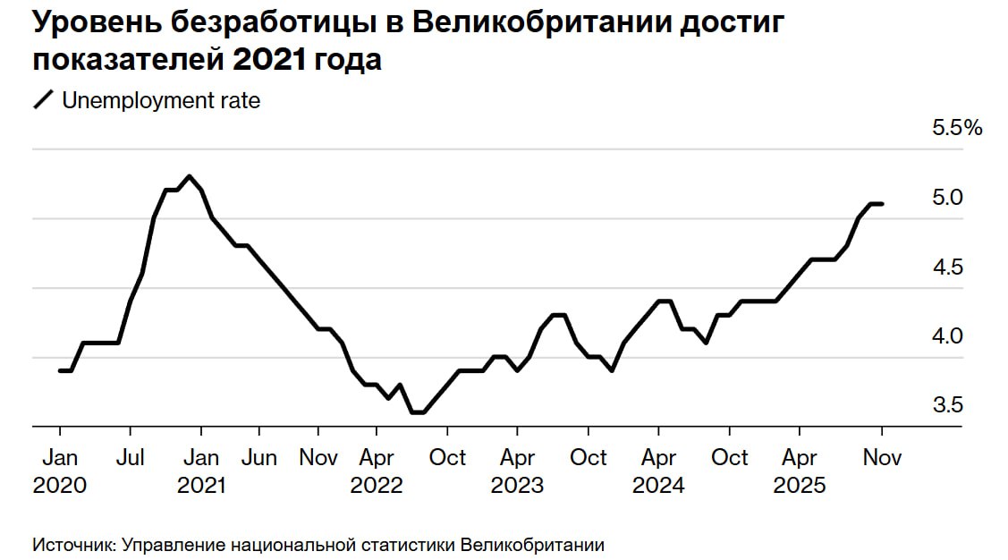 Рынок труда Великобритании демонстрирует тревожные признаки охлаждения. Согласно данным Управления национальной статистики, количество платных сотрудников в декабре сократилось на 43 000 — это самое значительное падение с 2020 года. Общий уровень безработицы достиг почти пятилетнего максимума в 5.1%.