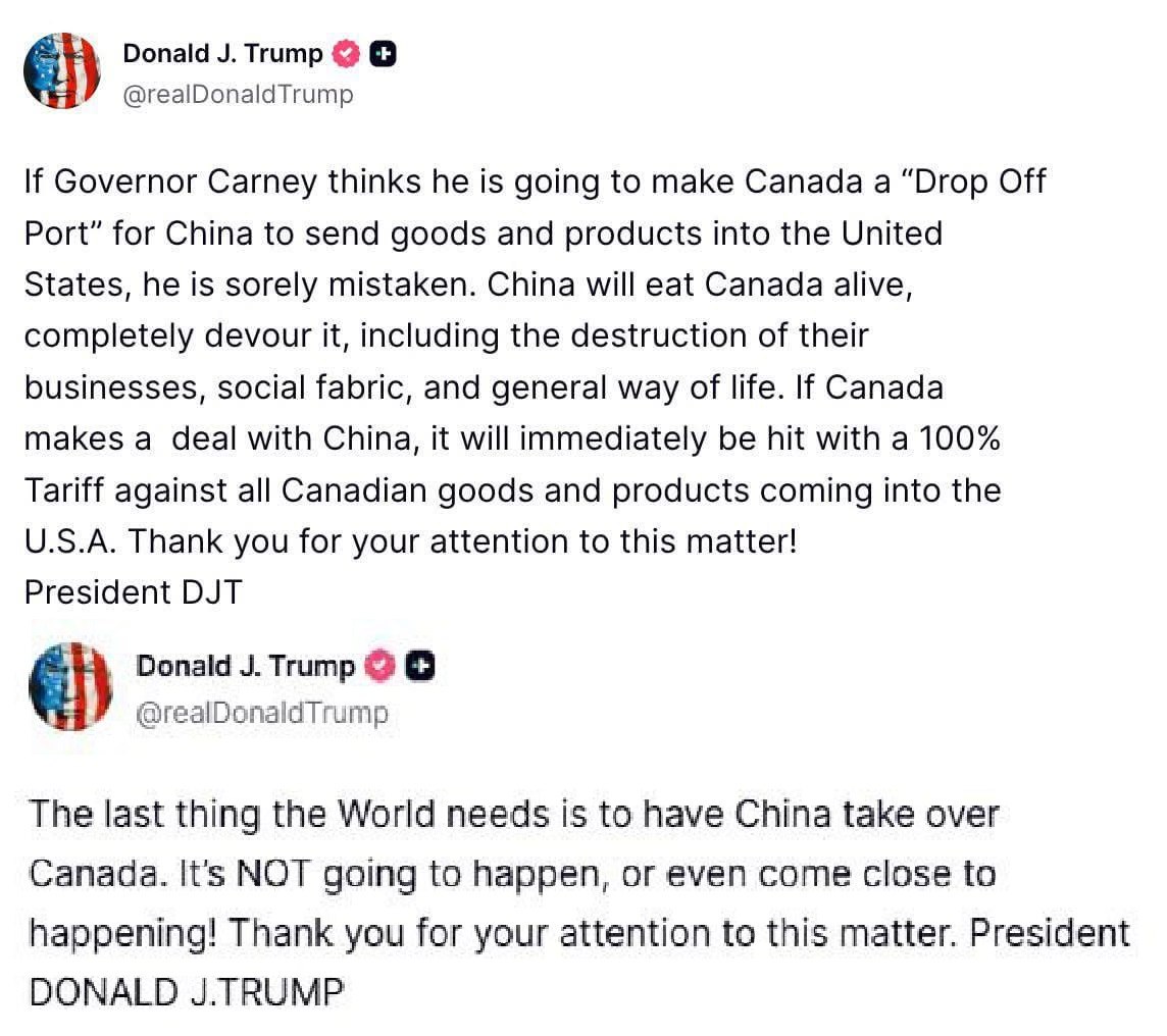 Если губернатор Карни считает, что сможет превратить Канаду в «перевалочный порт» для Китая, через который товары и продукция будут поступать в Соединенные Штаты, то он глубоко ошибается. Китай сожрет Канаду заживо, полностью поглотит ее — включая разрушение бизнеса, социальной ткани и привычного образа жизни. Если Канада заключит сделку с Китаем, по всем канадским товарам и продуктам, поступающим в США, немедленно будет введена 100-процентная пошлина. Благодарю за внимание к этому вопросу!