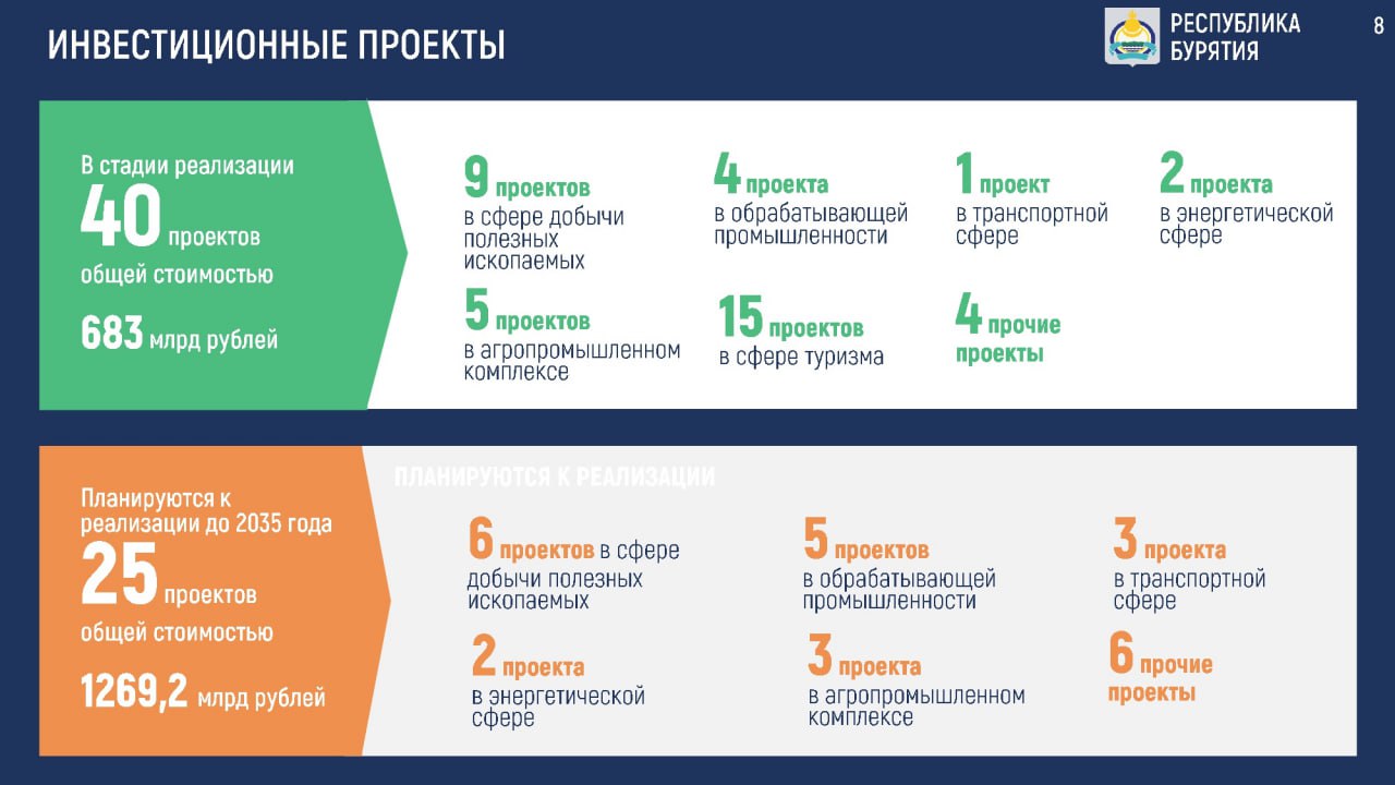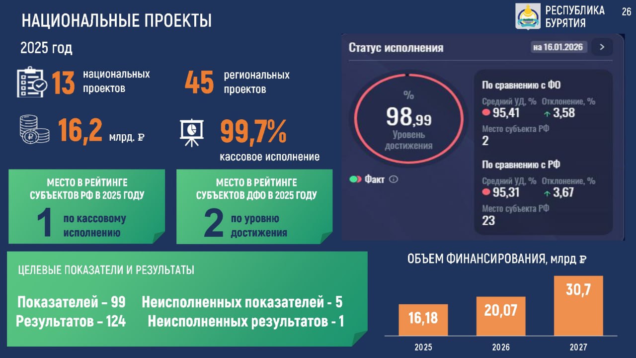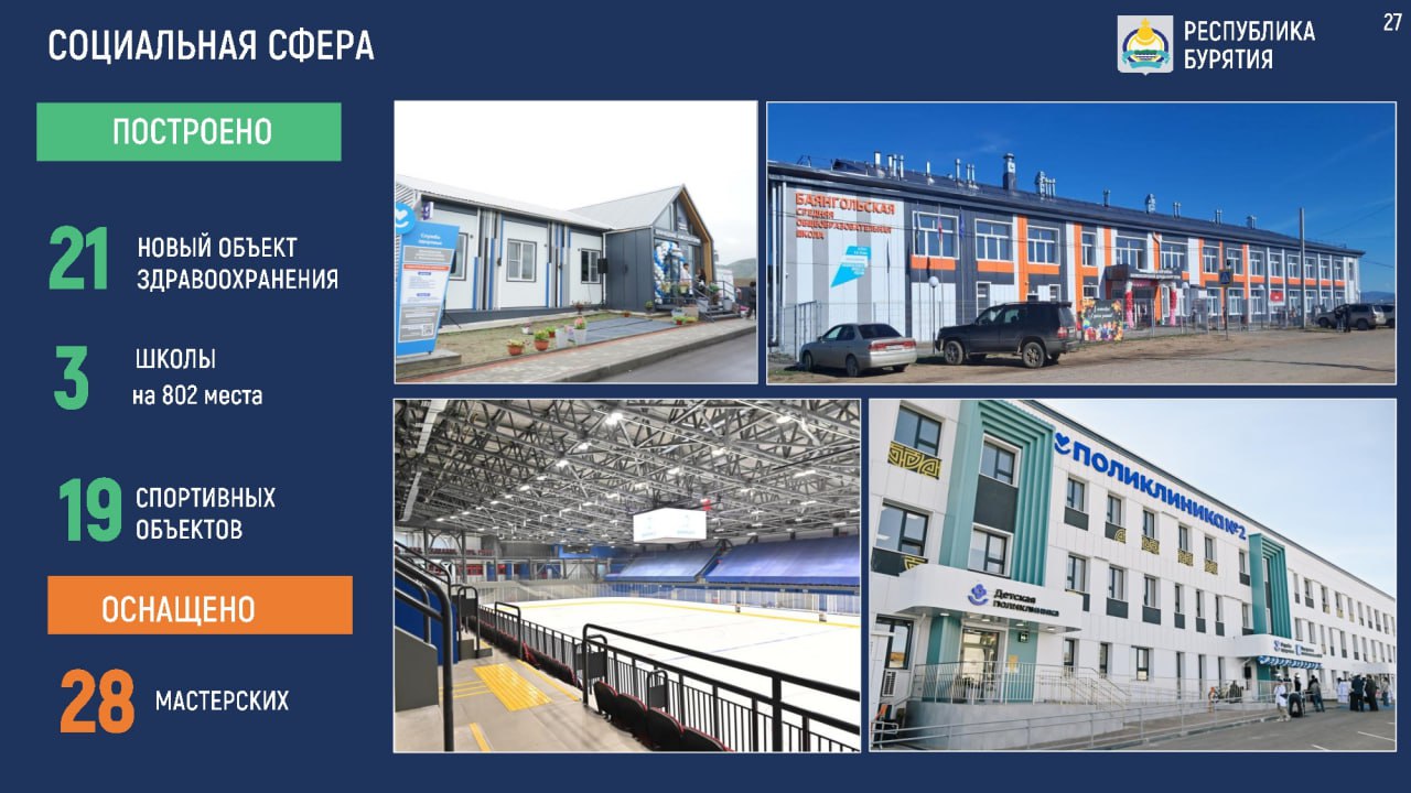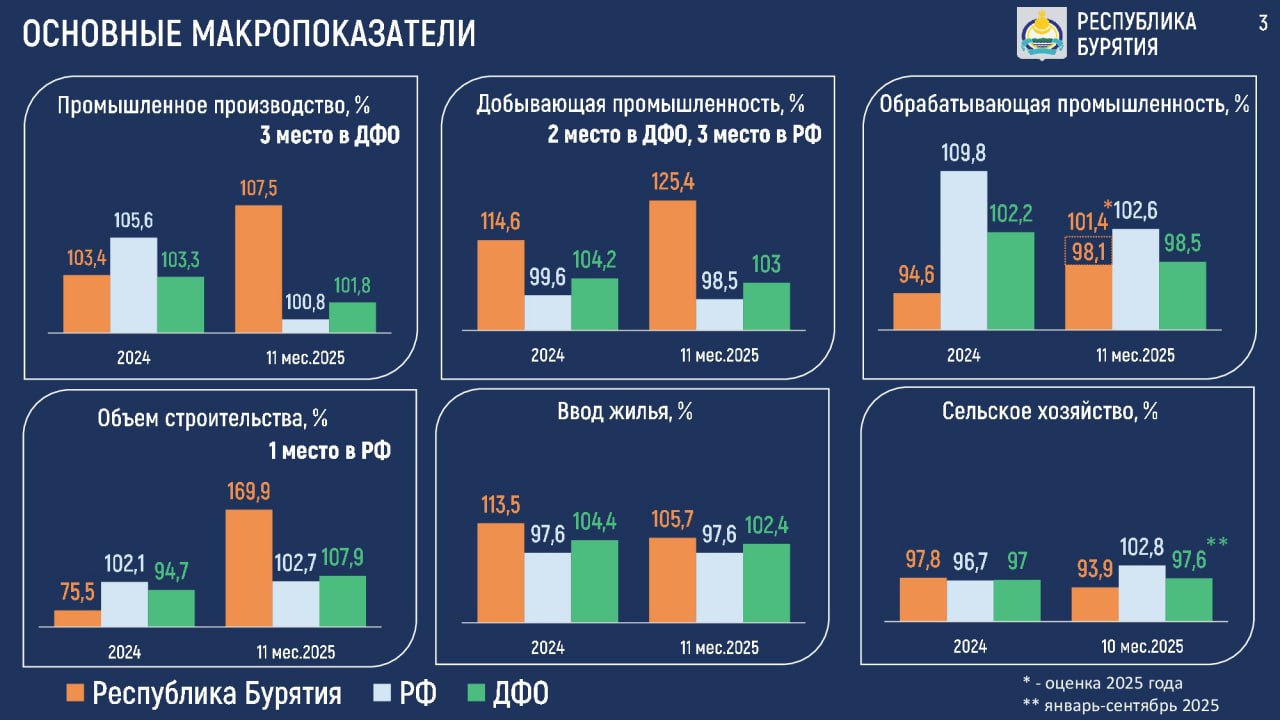 Доложил о ситуации в регионе. Год был непростым — и для Бурятии, и для всей страны. Сегодня у Улан-Удэстальмост сложная экономическая ситуация, непросто приходится Селенгинскому ЦКК и ряду других предприятий республики. Но, несмотря на все сложности, экономика растёт, промышленность прибавляет, особенно добывающая отрасль. По её росту мы сегодня — одни из лидеров не только на Дальнем Востоке, но и по стране. Продолжается строительство жилья, открываются новые объекты, растут собственные доходы бюджета. Главное — выдерживать темп и сохранять устойчивость.