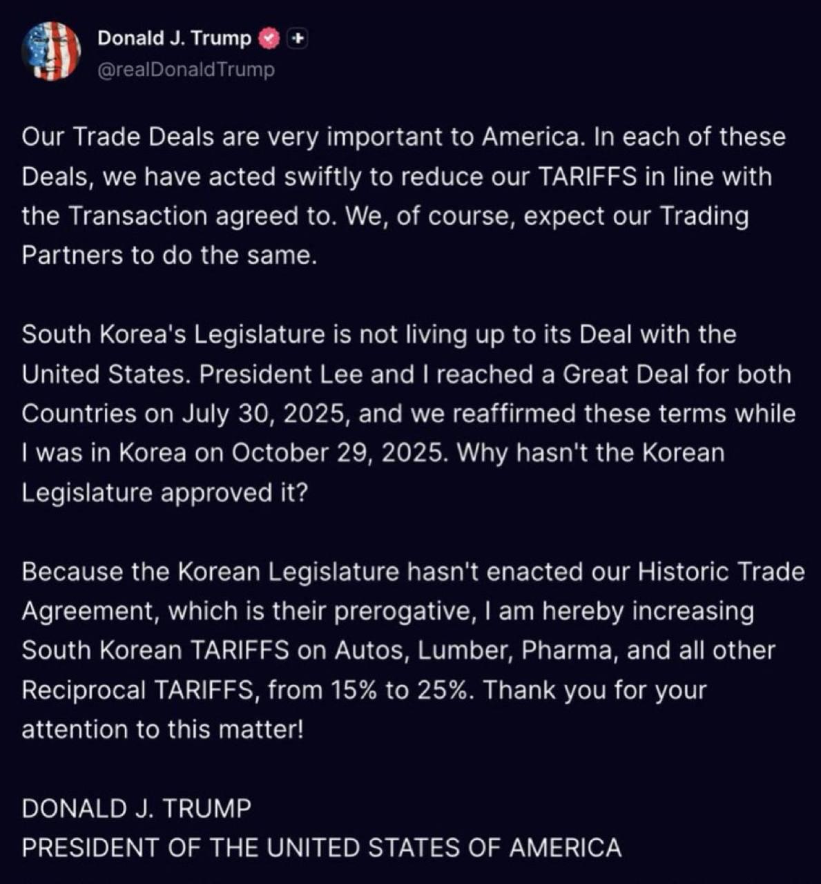 Поскольку законодательный орган Кореи не принял наше историческое торговое соглашение, что является их прерогативой, я настоящим повышаю тарифы Южной Кореи на автомобили, лесоматериалы, фармацевтическую продукцию и все другие взаимные тарифы с 15% до 25%,