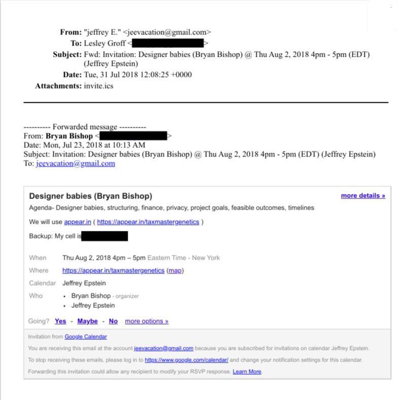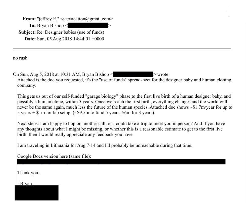 Брайан Бишоп, чьим планом было создание «первого живорожденного ребенка по заказу», обратился к Джеффри Эпштейну за финансированием своей схемы.