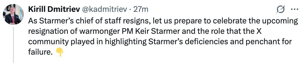 Кирилл Дмитриев заявил, что после увольнения главы аппарата Стармера стоит ждать отставку и самого премьер-министра.