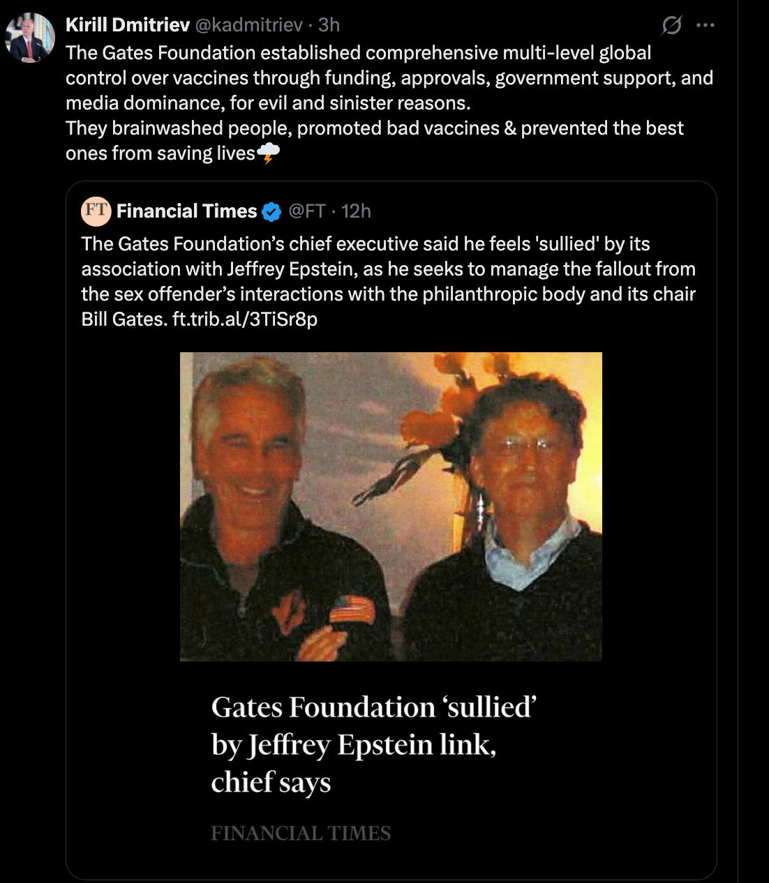 Такое мнение выразил спецпредставитель президента РФ по инвестиционно-экономическому сотрудничеству с зарубежными странами, глава РФПИ Кирилл Дмитриев, комментируя публикацию Financial Times о связи исполнительного директора фонда Гейтса с файлами Эпштейна.