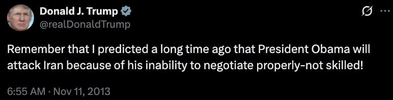 В 2013 году Дональд Трамп, тогда еще бизнесмен и будущий президент, жестко раскритиковал Барака Обаму за нападение на Иран. В твите он назвал такие действия проявлением слабости и неспособности вести переговоры должным образом.