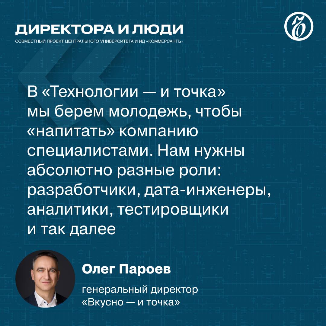 В «Технологии — и точка» мы берем молодежь, чтобы «напитать» компанию специалистами. Нам нужны абсолютно разные роли: разработчики, дата-инженеры, аналитики, тестировщики и так далее.