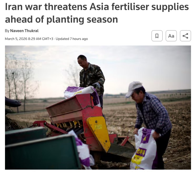 Еще до обострения ситуации на Ближнем Востоке рынок удобрений находился под серьезным давлением: Китай ограничил экспорт ради внутренних нужд, а в Европе производство сократилось после прекращения поставок российского газа. Но теперь, как констатирует Reuters, ситуация перешла в критическую фазу.