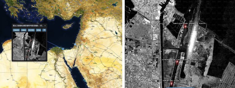 Китайский спутник с синтетической апертурой MizarVision, предположительно, засек авианосную группу США во главе с USS Gerald R. Ford в Суэцком канале (фото1).
