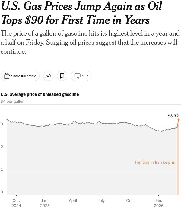 Это произошло на фоне военной операции против Ирана. По состоянию на утро субботы средняя цена на бензин в США составляет $3,41 за галлон.