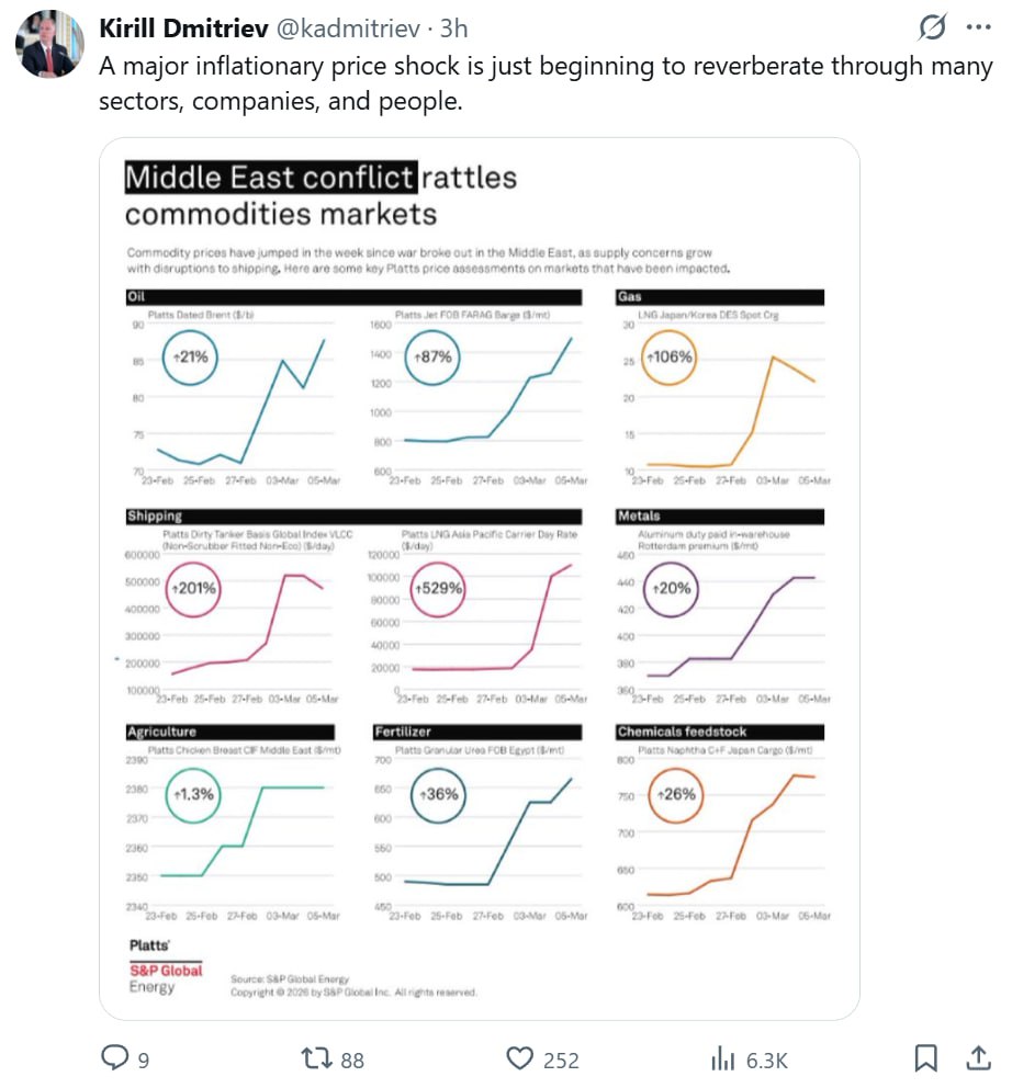 Спецпредставитель президента РФ по инвестиционному сотрудничеству Кирилл Дмитриев предупредил о начале масштабного роста цен по всему миру в связи войной на Ближнем Востоке: