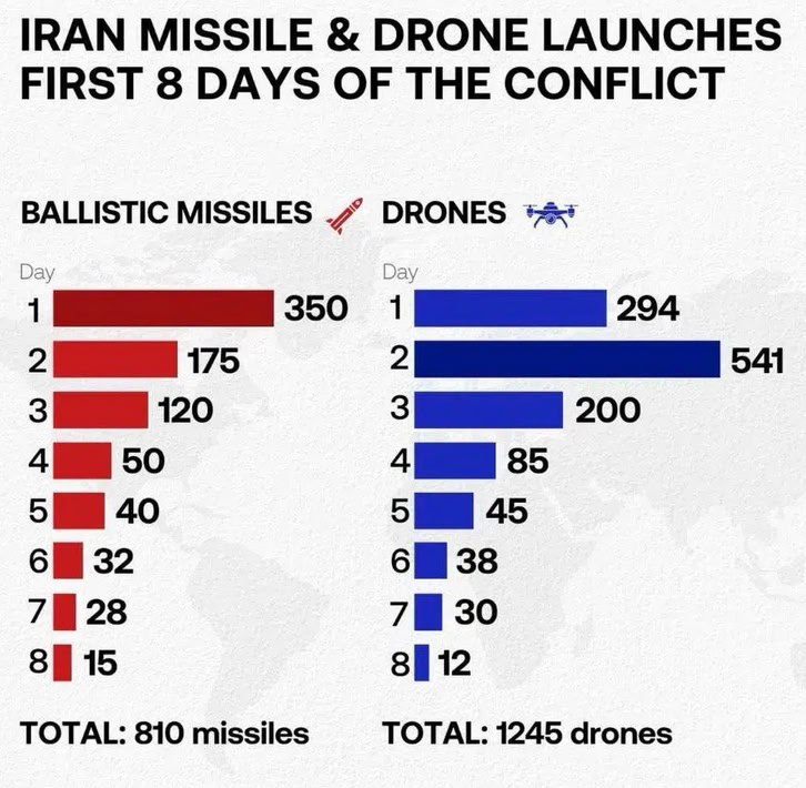 Как следует из статистики, Иран с каждым днем военного конфликта с США и Израилем запускает все меньше баллистических ракет и беспилотников. Всего за 8 дней Тегераном было выпущено 810 ракет и 1245 дронов.