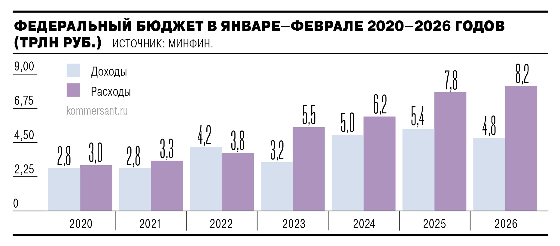За первые два месяца доходы отстали от расходов на рекордные 3,45 трлн рублей. Столь внушительная «дыра» в бюджете объясняется проседанием нефтегазовых доходов при существенном росте трат января—февраля.