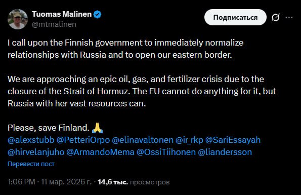 Пожалуйста, спасите Финляндию", — заявил профессор Хельсинкского университета Туомас Малинен.