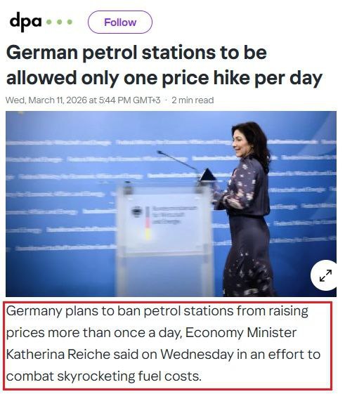 Правительство Германии по примеру Австрии введёт правило, согласно которому повышать цены на горючее можно будет только раз в день. Такая практичность, как считают в кабмине ФРГ, поможет обуздать галопирующий рост стоимости бензина и солярки. Пока же цены на топливо ужасают немцев, привыкших к порядку и размеренности.