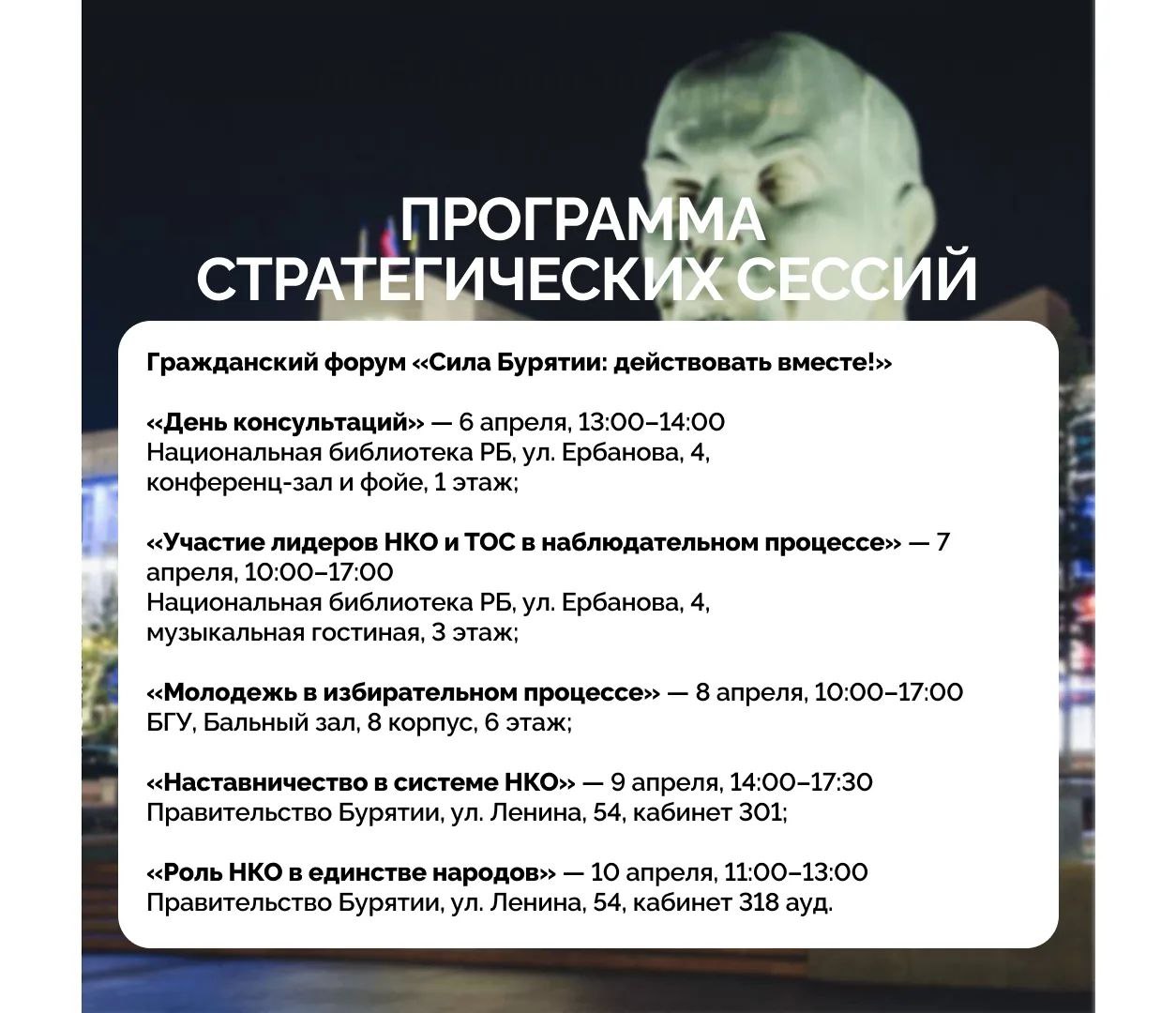 «Проведение стратегических сессий перед форумом «Бурятия сегодня. Бурятия завтра!» позволит нам собрать лучшие идеи и проекты со стороны экспертного сообщества и гражданского общества. Это эффективный формат взаимодействия власти, бизнеса и общества, который применяется в Бурятии с 2020 года. Только в прошлом году в ходе такого открытого совещания «Наша Бурятия» участниками было выдвинуто более тысячи предложений, которые легли в основу программ развития республики», — отметила заместитель руководителя Администрации Главы и Правительства Бурятии по информационной политике, связям с общественностью и общественным проектам Ирина Доржиева.