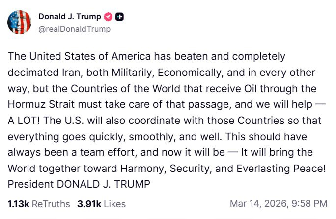 Трамп заявил, что после «разгрома Ирана», страны, импортирующие нефть через Ормузский пролив, должны сами обеспечивать его безопасность.
