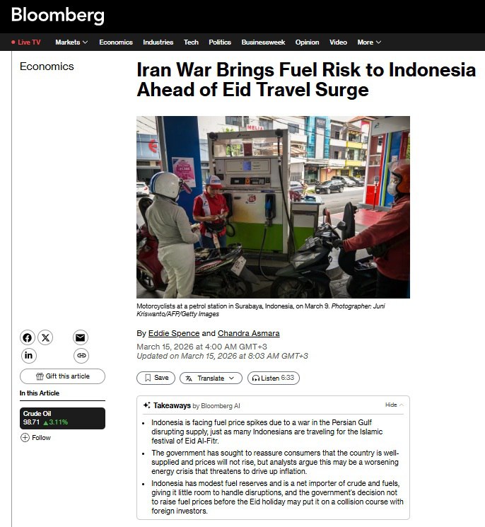 Самая населенная мусульманская страна мира готовится к массовому исходу на праздник разговения, но топливные запасы тают на глазах. Индонезия импортирует большую часть нефтепродуктов из региона Персидского залива, поставки из которого нарушены из-за блокады Ормузского пролива. Правительство убеждает граждан, что все под контролем, но аналитики бьют тревогу.