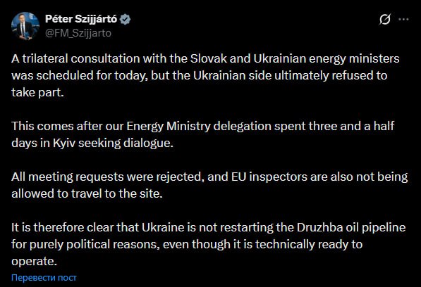Очевидно, что Украина не возобновляет работу нефтепровода "Дружба" по сугубо политическим причинам, несмотря на то что технически он функционирует", — заявил Сийярто.