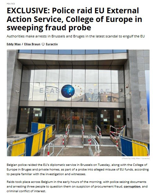 По словам людей, знакомых с ходом расследования, и свидетелей, бельгийская полиция во вторник провела обыски в дипломатической службе ЕС в Брюсселе, а также в Европейском колледже в Брюгге и частных домах в рамках расследования предполагаемого нецелевого использования средств ЕС,