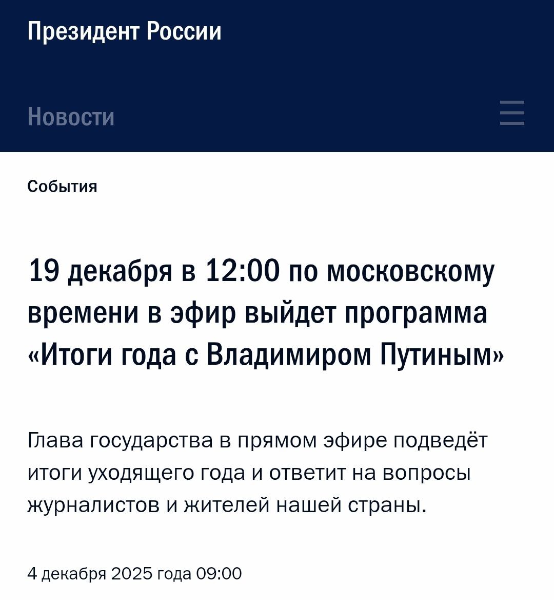Путин проведет «Итоги года» 19 декабря 2025 года в 12:00