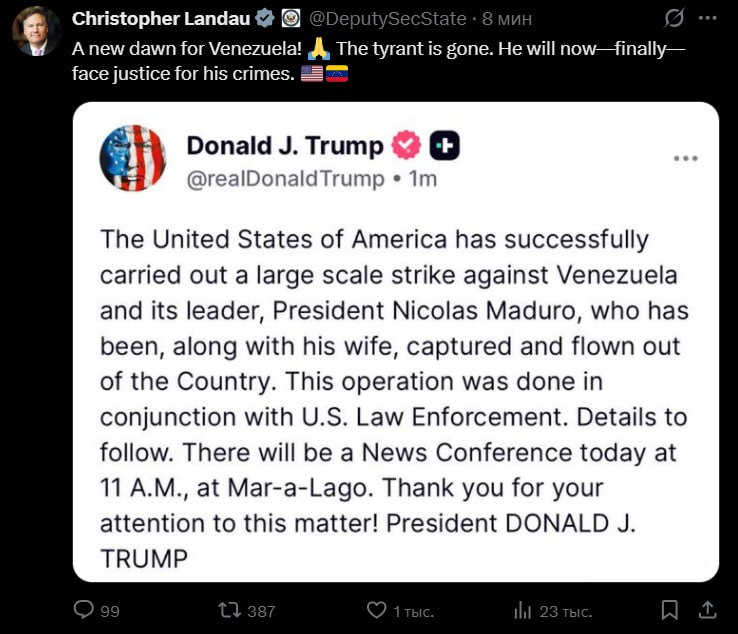 Еще заявления американского президента в разговоре с The New York Post:США на данном этапе думают больше о восстановлении нефтяной инфраструктуры Венесуэлы, чем о выборах там.В Венесуэле нужно восстановить «закон и порядок», прежде чем проводить...