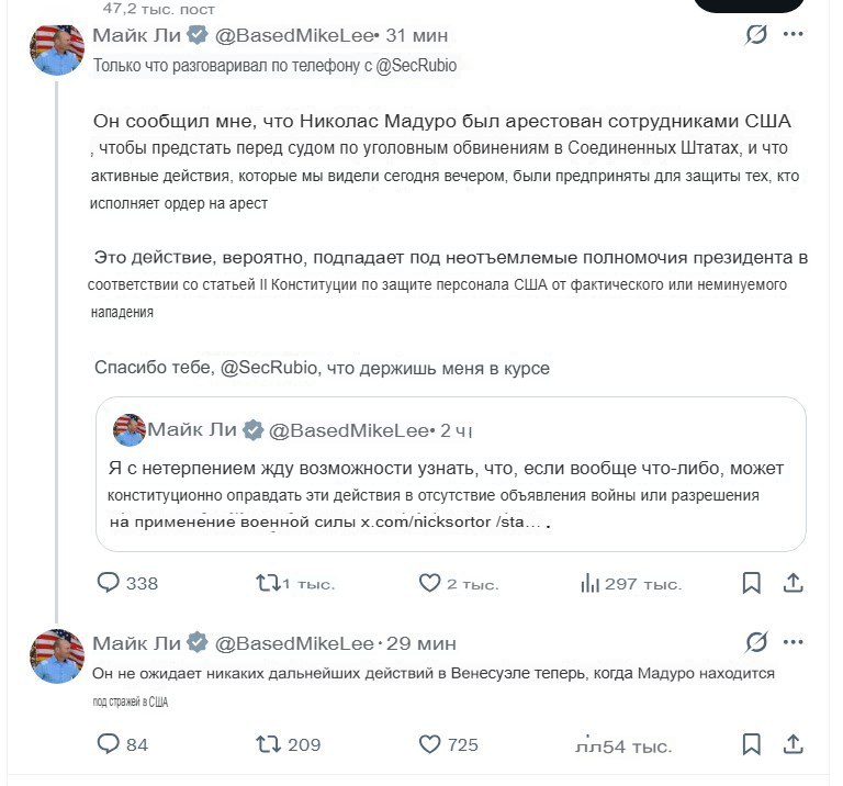 Мадуро захватили и арестовали для предъявления ему обвинений по уголовным делам в США, заявил сенатор Майк Ли со ссылкой на разговор с госсекретарем США Рубио. А ещё сенатор поделился, что дальнейших атак на Венесуэлу не планируют.