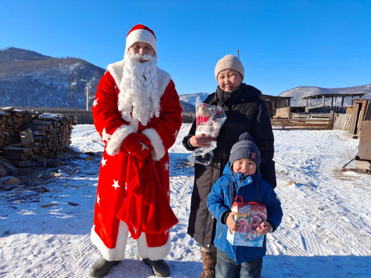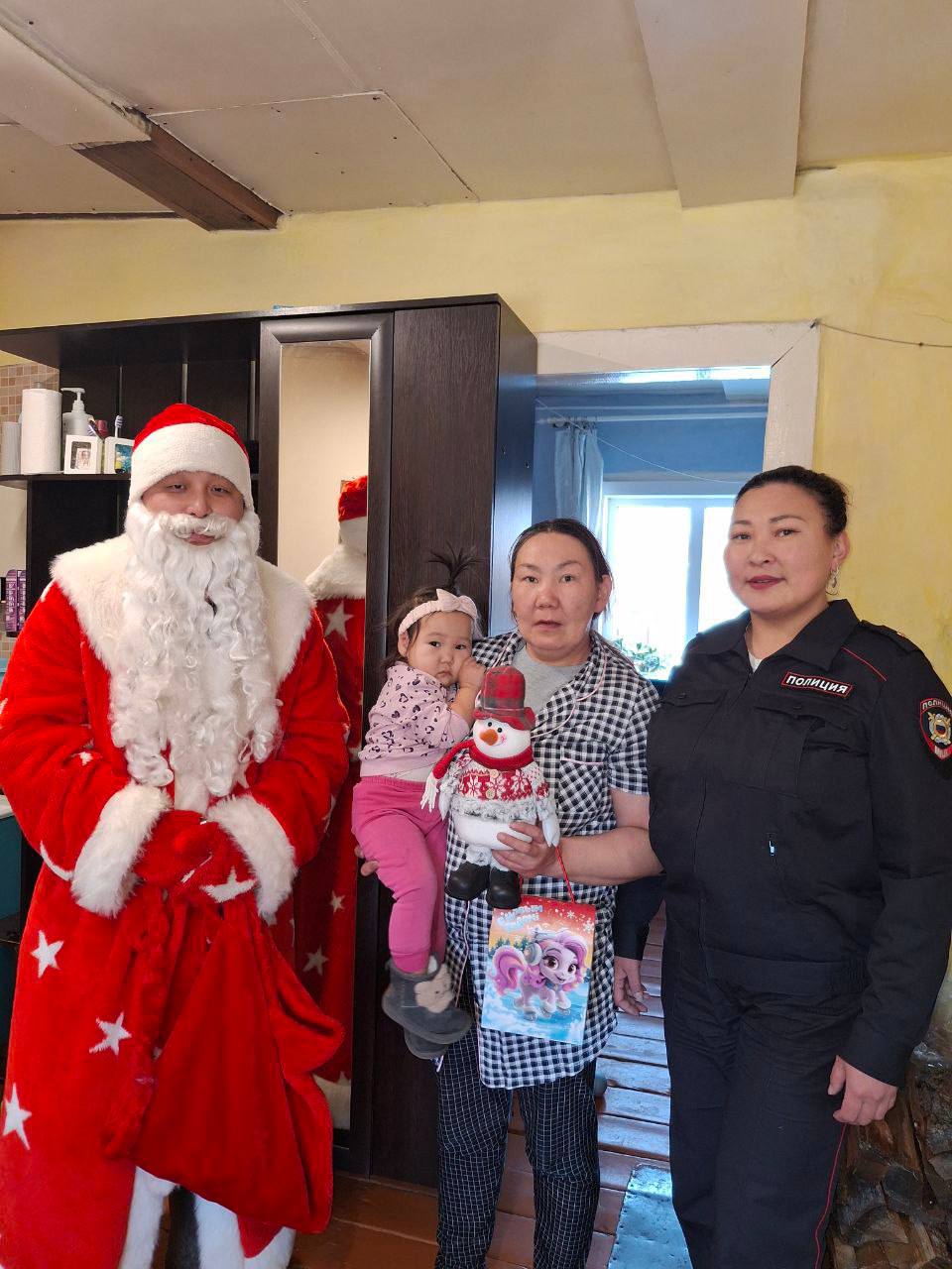 В Окинском районе начальник пункта полиции Зоригма Гергенова вместе с Дедом Морозом порадовали детей коллег, создавая атмосферу праздника и волшебства.