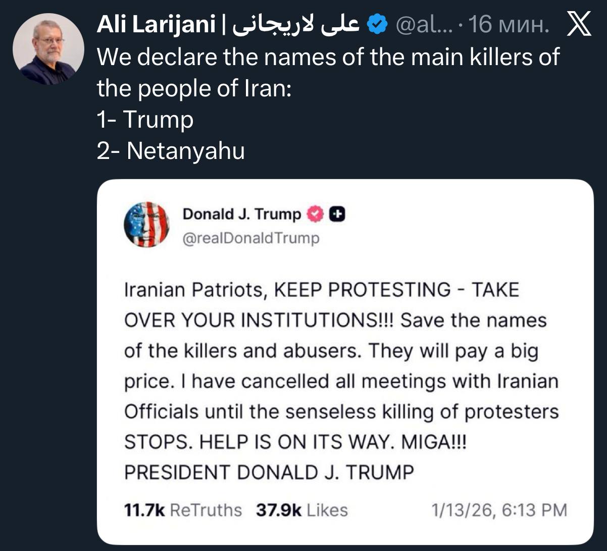 Секретарь Высшего совета национальной безопасности Ирана Али Лариджани обвинил президента США Дональда Трампа и премьер-министра Израиля Биньямина Нетаньяху в гибели иранского народа. Он заявил, что именно они являются «главными убийцами».