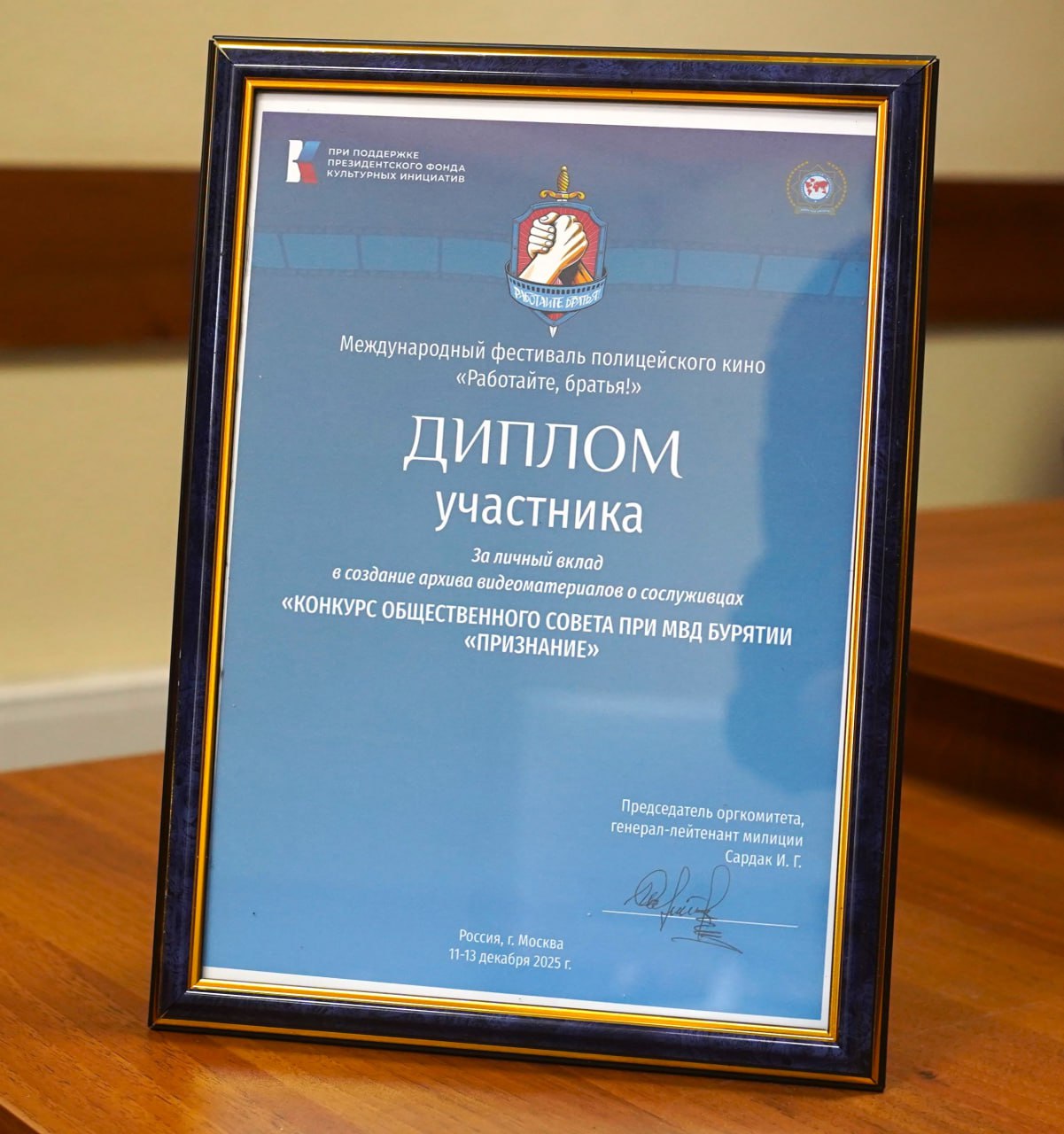 Жюри, в состав которого вошли именитые деятели киноиндустрии, оценивало конкурсантов в семи номинациях. Из представленных конкурсных фильмов судьи отдельно отметили мини-фильм МВД Бурятии. Творческая работа сотрудников пресс-службы МВД Бурятии, посвящённая конкурсу Общественного совета при региональном министерстве «Признание», была удостоена диплома за вклад в создание архива видеоматериалов о сослуживцах.