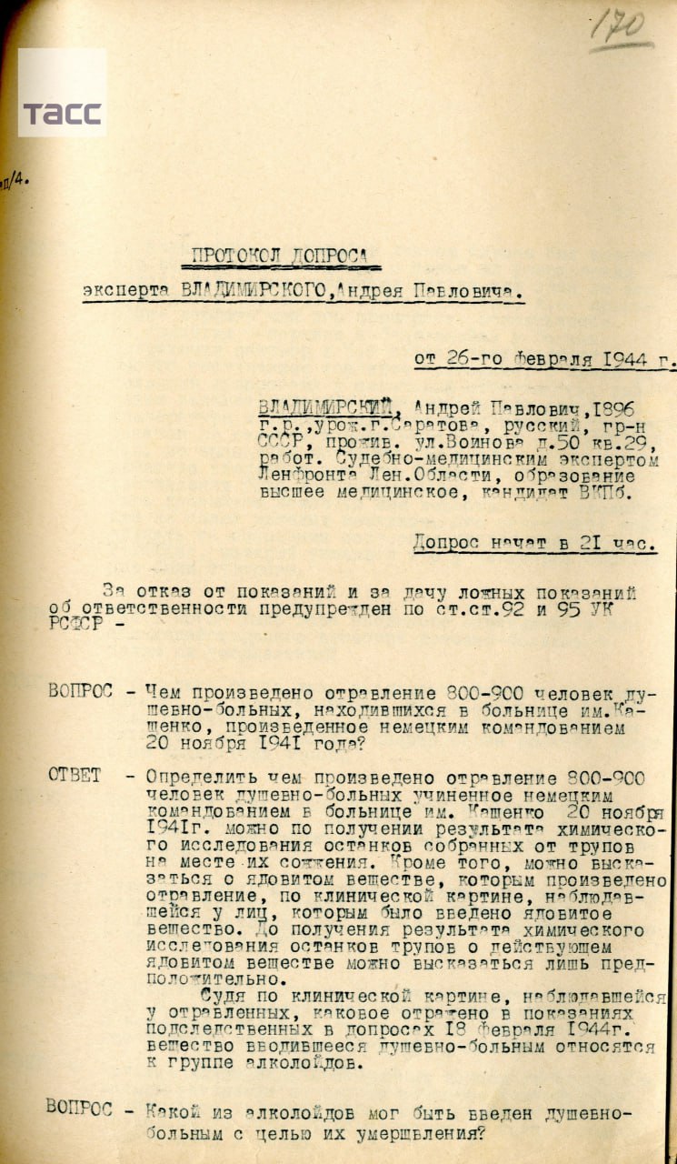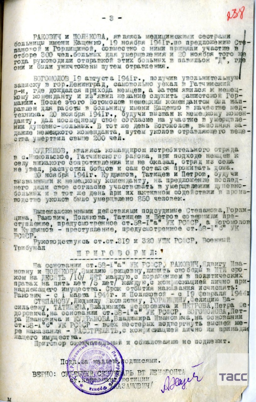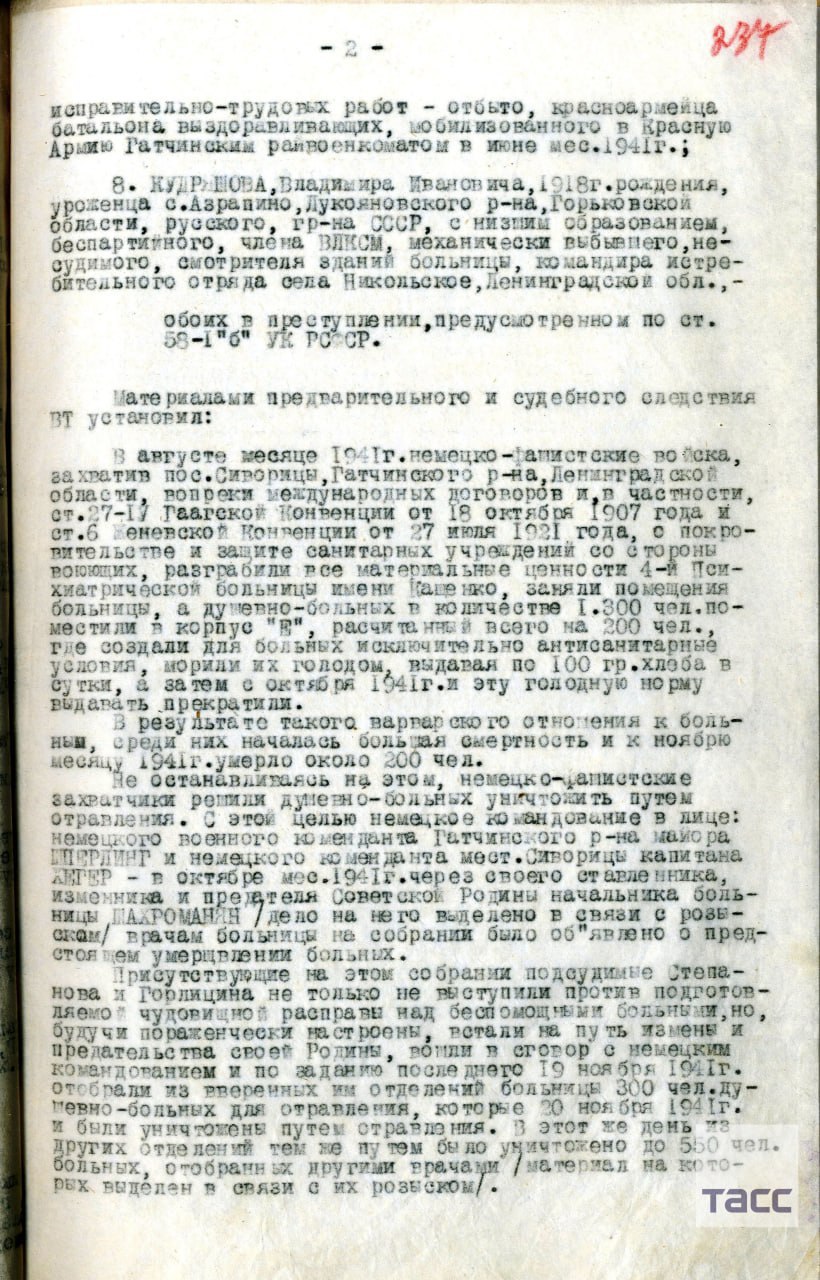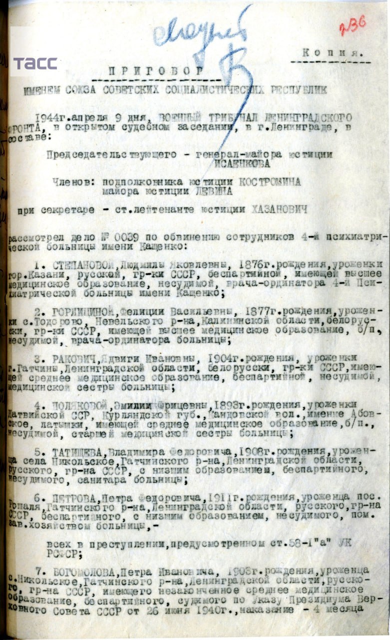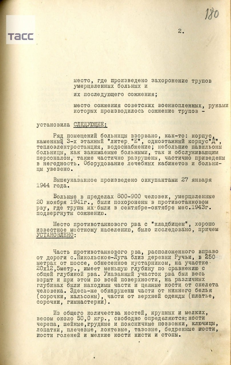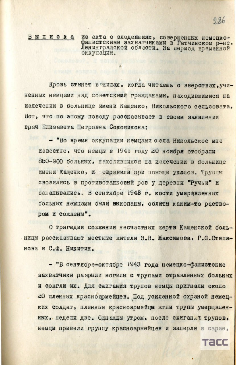 Достоянием общественности стали документы, которые подтверждают массовое убийство нацистами пациентов больницы для душевнобольных, которая располагалась под Ленинградом, в ноябре 1941 года.