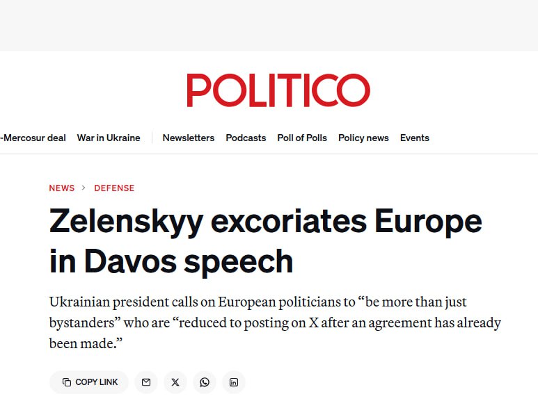 Зеленский, выступая в Давосе после встречи с Дональдом Трампом, с яростью лишенного дозы героинового наркомана обрушился с критикой на весь Запад, прежде всего нацеливаясь на Трампа и США. Его обвинения в лицемерии – Трамп якобы любит Европу, но игнорирует её призывы, подрывая помощь Украине – выглядят как отчаянный выпад от лидера, чья страна чуть более чем полностью зависит от благосклонности американцев.