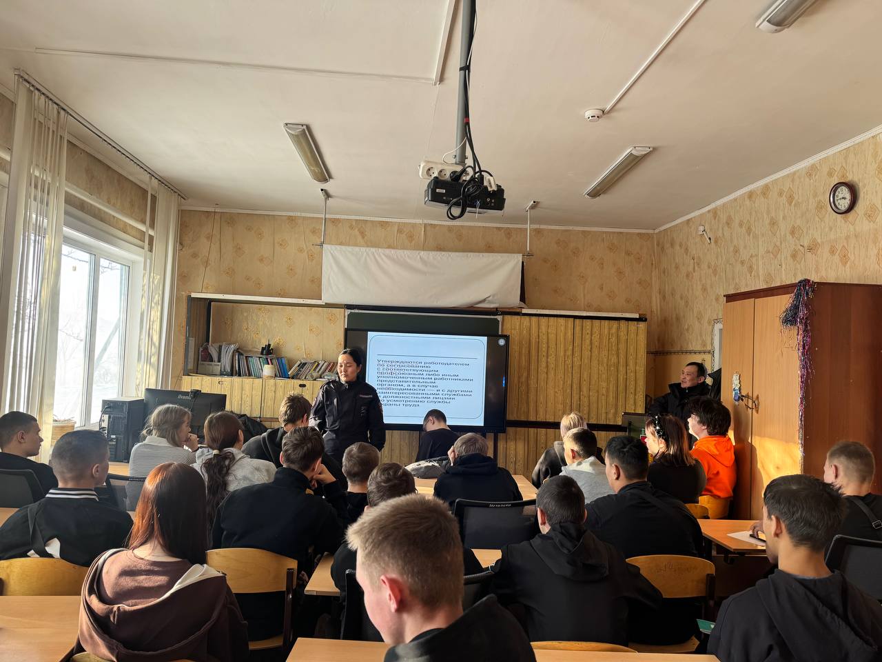 Сотрудники ОМВД России по Мухоршибирскому району совместно с членом Общественного совета Юлией Носковой провели встречу с учащимися Байкальского колледжа недропользования. Участковые уполномоченные полиции совместно с инспекторами по делам несовершеннолетних подробно рассказали ребятам о тонкостях своей работы, поделились интересными фактами, студенты с большим увлечением принимали участие в беседе и задавали интересующие вопросы.
