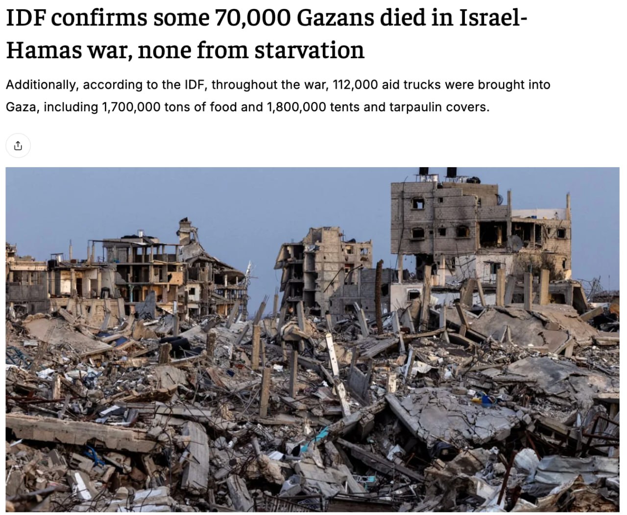ЦАХАЛ впервые подтвердил, что около 70 тысяч жителей Газы были убиты во время войны между Израилем и ХАМАС, одновременно оспаривая процент погибших среди гражданского населения, заявленных ООН, и утверждая, что ни один здоровый человек не умер от голода,